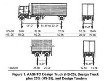 The “design truck” and design lane load. The “design truck” is the same as the HS20 truck from the previous version of AASHTO (described above). The HS20 vehicle is shown in Figure 1 above.