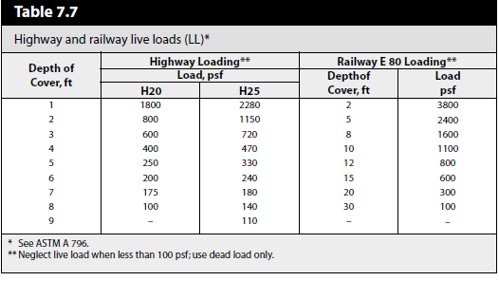 Pipe designed under railroad loading should follow Cooper E-80 Live Loading per the American Railway Engineering and Maintenance-of-Way Association (AREMA) specifications. This loading consists of 80-kip axle loads spaced 5 feet on centers. The live load pressures at various cover heights can also be found in Table 7.7. It is easy to see that the live loads produced under Cooper E-80 loading are considerably larger than those of the AASHTO design trucks. It should also be noted that under AASHTO design vehicles, there is no live load felt above 8’ and 9’ of cover, respectively, for HS20 and HS25 design vehicles, while under Cooper E-80 loading live load pressures are felt for pipe up to 30’ of cover!