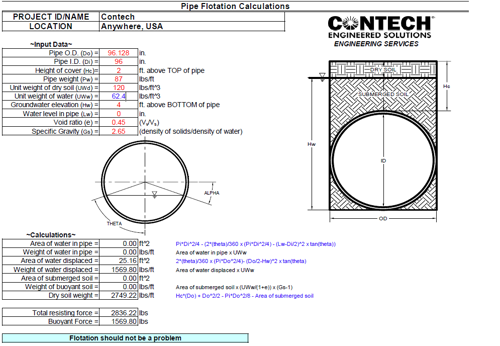 Next, the buoyant force is calculated. The buoyant force equals the area of the water displaced multiplied by the unit weight of water (62.4 lb/ft3). If the resisting forces are greater than the buoyant forces, pipe flotation should not be a problem, and countermeasures are not required. The example below shows all of these calculations.